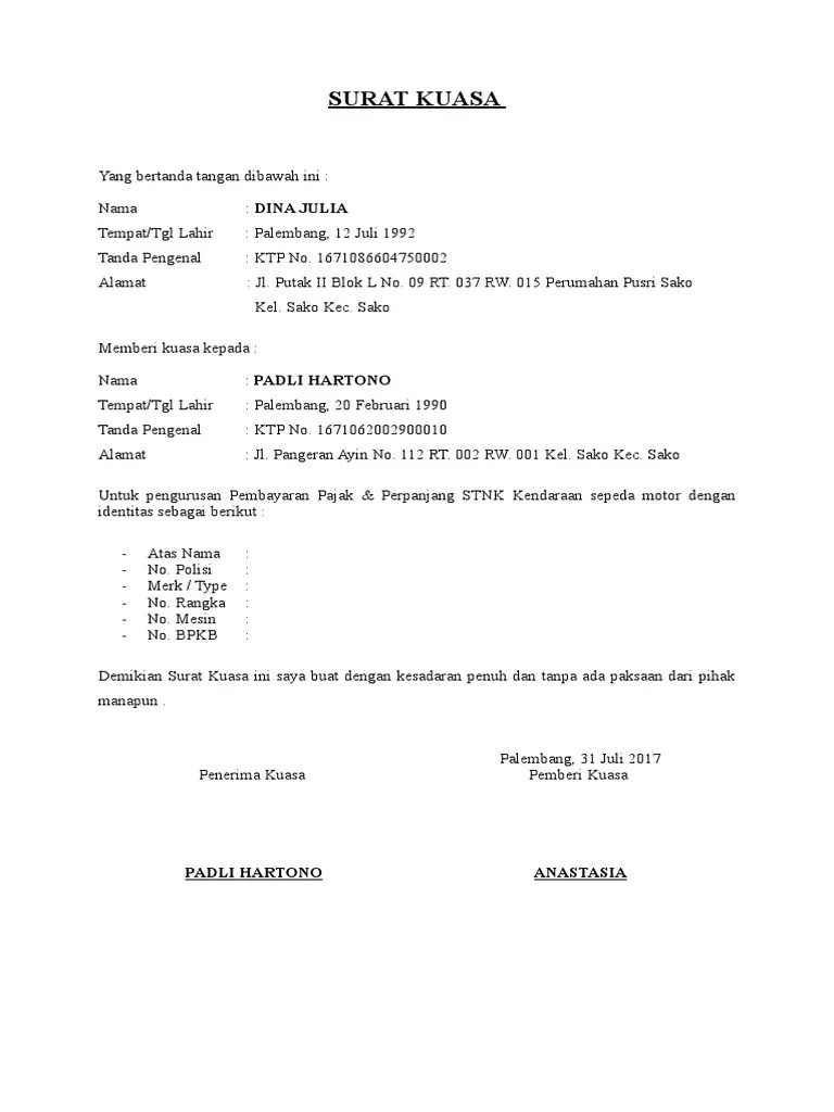 Masa keanggotaan adalah sejak tanggal penandatanganan surat ini. Surat kuasa pengambilan bpkb pun . Setiap pemilik kendaraan motor maupun mobil harus memiliki bukti kepemilikan kendaraan bermotor (bpkb). Berikut kami telah merangkum contoh surat kuasa pengambilan bpkb dan. 8, dokumen kepemilikan kendaraan bermotor khusus berupa bukti pemilikan .